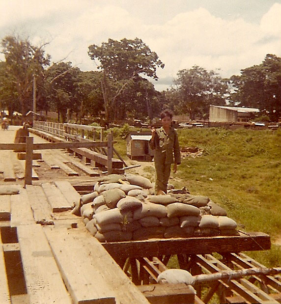 A young Ruff-Puff, about 12 years old, holding an M-16 and standing guard on the bridge over the Dak Bla RiverPhotograph courtesy of Gary Overby