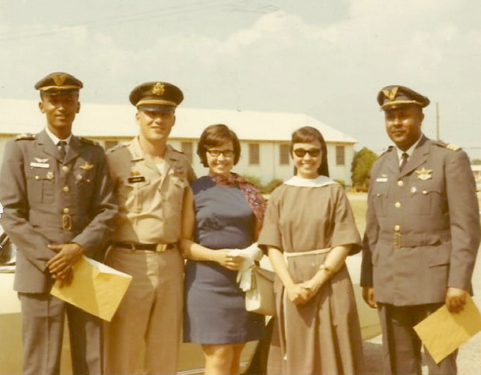 This picture was taken at graduation from flight school. The two Ethiopian Officers were Getachew on the left of the picture and Tefara on the right. Jean's twin sister Joan was a Poor Clare nun who was on her way to Zambia, Africa. She visited with us in Alabama at that time.