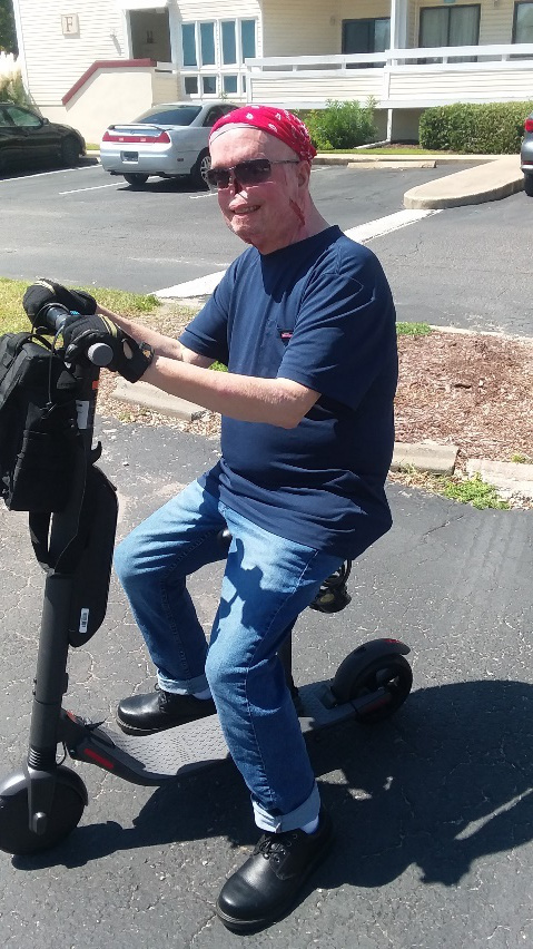 After the golf cart, I tried to solve the transportation problem for Rick by purchasing an electric scooter. I took it to the parking lot at the condo to see if Rick could use it. After a couple of spins around the parking lot Rick decided he was too unstable on it and did not want to use it. After that, I took it home. I put a picture of Rick trying to ride the scooter below.
