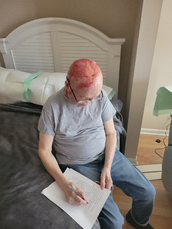 I included a picture from that day below of Rick pushing a basket at the grocery store in Myrtle Beach SC. He still had on the “stocking hat” cover for his head which covered the open wounds on his head from the disease. His scalp was constantly “weeping” blood.