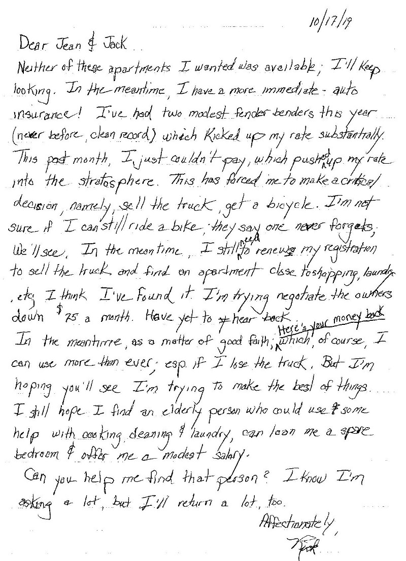 In Rick’s 10/17/19 letter he told me about a major problem he had. In January he was involved in a couple of small fender bender accidents with his truck and he had also missed a payment on his insurance, so he lost his car insurance. To reinstate it, the cost was more than he could afford. Because he did not have insurance, he could not renew his registration for his truck. He had been stopped by the police and was cited for driving an unregistered vehicle. Fortunately, they did not impound his truck but they gave him a court date for the offense.