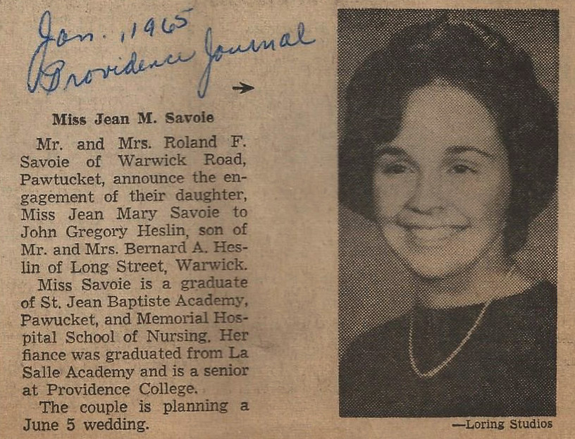 We went out almost every weekend from that time on and at times, more frequently. I was totally in love with Jean and, sometimes, while driving through Providence, I would open the window of the car and shout at the top of my lungs; "I love Jean Savoie!"
