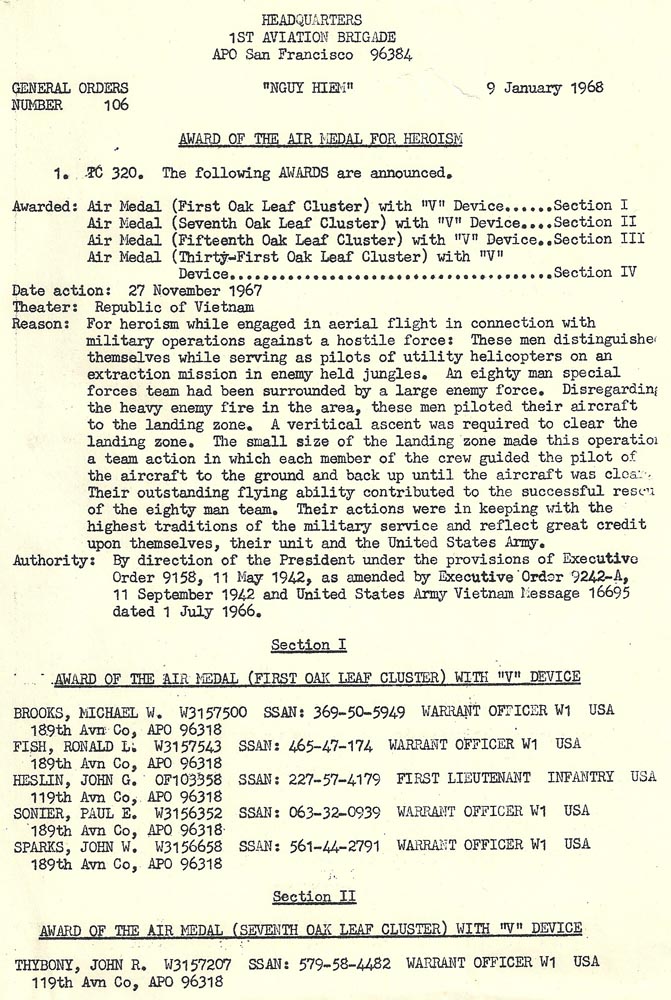In view of the extreme danger of the mission, the difficulties presented by the landing zone and the constant hazard of enemy fire I strongly recommend the mission commander and C&C ship AC MAJ Sanders for the Silver Star, the ass't mission commander and C&C pilot MAJ Leva for the DFC, all other AC's for the DFC the remainder of the crew for the Air Medal with "V" device."(Signed)